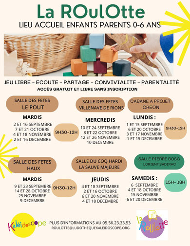 Vous pouvez nous contacter par téléphone au 05.56.23.33.53 ou par mail (laroulotte@ludothequekaleidoscope.org).